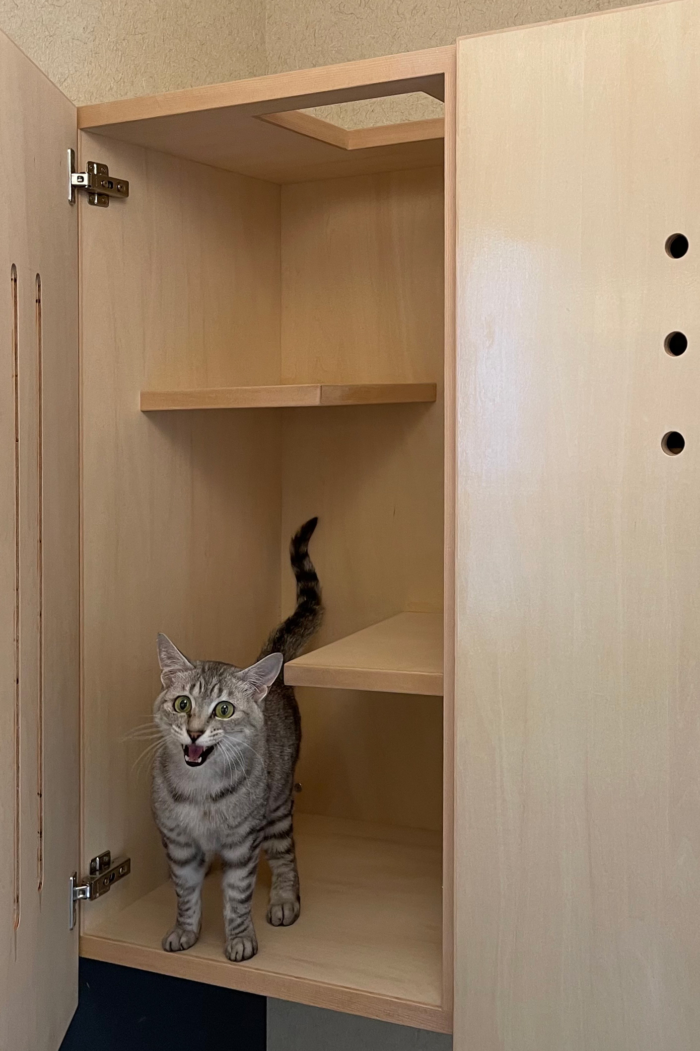 1階のキャットウォークが行き着く先は和室なのですが、猫が丈夫を歩くことができる吊り収納のには穴が開けられていて、さらには内部に階段上の足場があり、猫は内部を上下動できますが、行き止まりになっています。