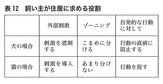 上記の表は『ペットと暮らす住まいのデザイン(増補改訂版)廣瀬慶二 著』からの引用ですが、その背景には、報酬ベースのトレーニングの考え方やオペラント条件づけがあります。刺激と反応、行動随伴性を無視して伴侶動物との暮らしをデザインすることはできません。形だけを模倣したものが多いですが、理論が大切です。