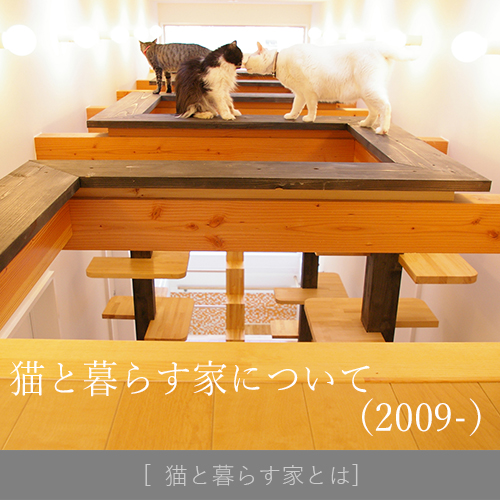 例えば、 The Cats' house(2009年8月竣工)のような 「猫の生態」をきちんと把握した上で、彼らの身体寸法に合った立体的な多層的空間を創造し※1、 猫にとって必要なもの(麻縄を巻いた爪とぎ柱など)をあらかじめ家の構成要素の一つとして用意しておくと、家を破壊されることもなく※2、人も猫もストレスが少なくて済む、幸せな暮らしが実現できます。
