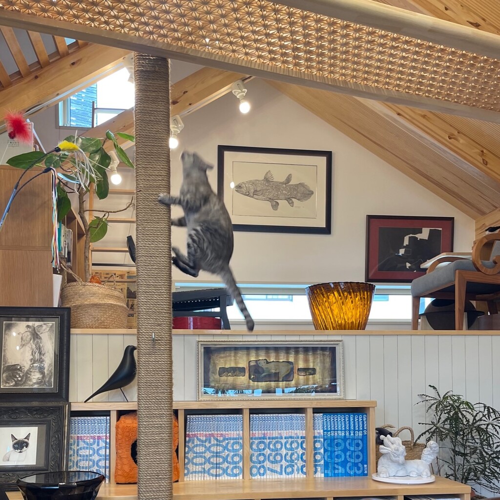 猫は飼われていたとしても、精神に野生の部分を残している動物です。なのに、狩りはさせてもらえないし、走りたいのに直線距離は短すぎるし、 気が済むまで散歩をしたいのに、狭い家の中ではすぐに行き止まり。 ダッシュやジャンプ、高いところに行きたい衝動も、家の中ではまったくできない。 おもちゃみたいなキャットツリーじゃ、ちっとも楽しくないっていうか昼寝用のベッドです。結局、人にとって都合が良く、それでいて、活き活きとした猫の姿を見たいなら、 「普通の家」ではダメだということを、多くの猫好きの方々が気づき始めた気がします。 私達が猫に対して無理強いしている「空間的制限」が一つでも多く無くなるように、 飼い主が、ちゃんと応えてあげれば、 「破壊行動」や「捕食行動」なしでも、猫たちの「躍動する本当の姿」を見ることはできるのです。