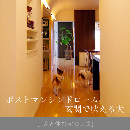 この悪循環を断ち切るためには、犬が(人間が)無駄吠えをしないようにトレーニングすることが大切です。建築的にはポストマン・シンドロームに陥らないように玄関と犬の居住スペースをできるだけ離して、視界からも外す様にしています。そしてインターホンも取り換えるか、仕組みを変更してしまいます。