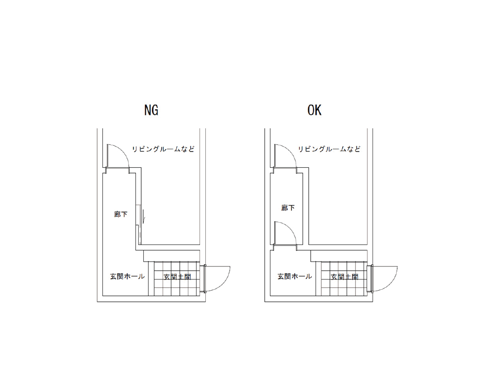 あらゆる家庭内のしつけやトレーニングには、それなりの広さやバッファーゾーンが必要です。犬と暮らす家を設計する場合、私は無駄とも思えるくらい、玄関ホールや玄関土間は広くとりたいと思っています。下の図は、簡単なバッファーゾーンのつくり方の例です。