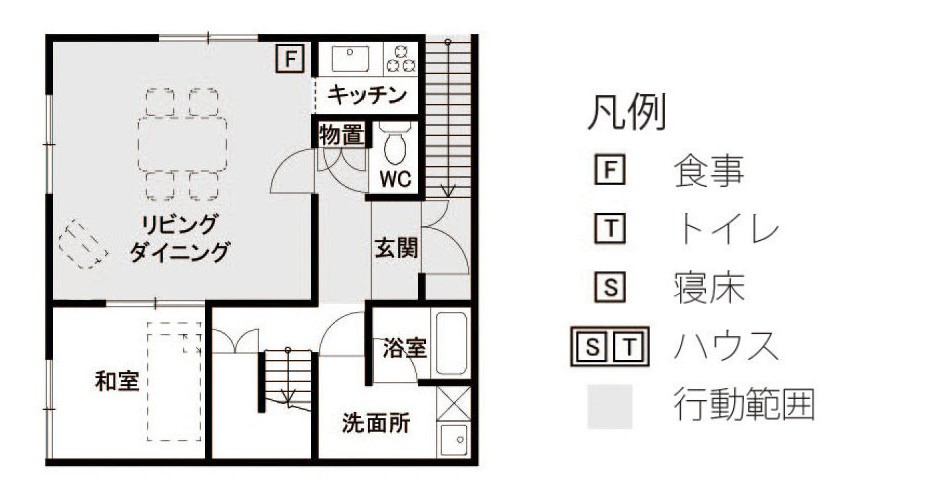 犬には最小単位の縄張りとして「コア」と呼ぶべきものがある。それは食事場所または逃げ込む場所に該当する。逃げ込む場所に関しては室内飼育の場合「ハウス」を用意していればそれになるが、食事の場所を併設する場合が多いので、コア=食事場所と仮定してもよいだろう。犬は自分のコアスペースを守る。コアを外部からの侵入者から守る目的で吠える。来訪者への威嚇の程度やタイミングはその住居の間取りによって変わる。凡例の「F」を見ていただければわかるが、図1の場合はリビングダイニングの1/4 程度はコアに該当するだろう。図2の場合はキッチンとその入り口周辺がコアに該当する。
