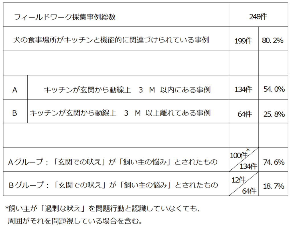 飼い主が困っている問題行動の1 位は「過剰な吠え」である。前述のコアを守るための犬の威嚇行為がそれにあたる。そこで248 件中、図1 に近い間取りの134 件と図2 に似通った64 件を比較すると面白い結果がえられた。