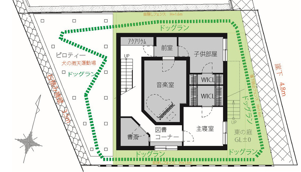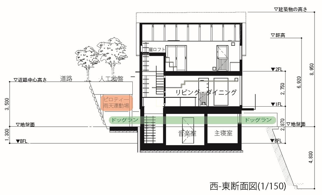 これがその特殊な土地で計画した地盤面位置の平面図断面図です。犬が逃亡するような事故がおきないことを読み取って頂けると思います。庭と道路が繋がっていないのですから、ドッグランのある庭から犬の逃亡が起きるはずがありません。