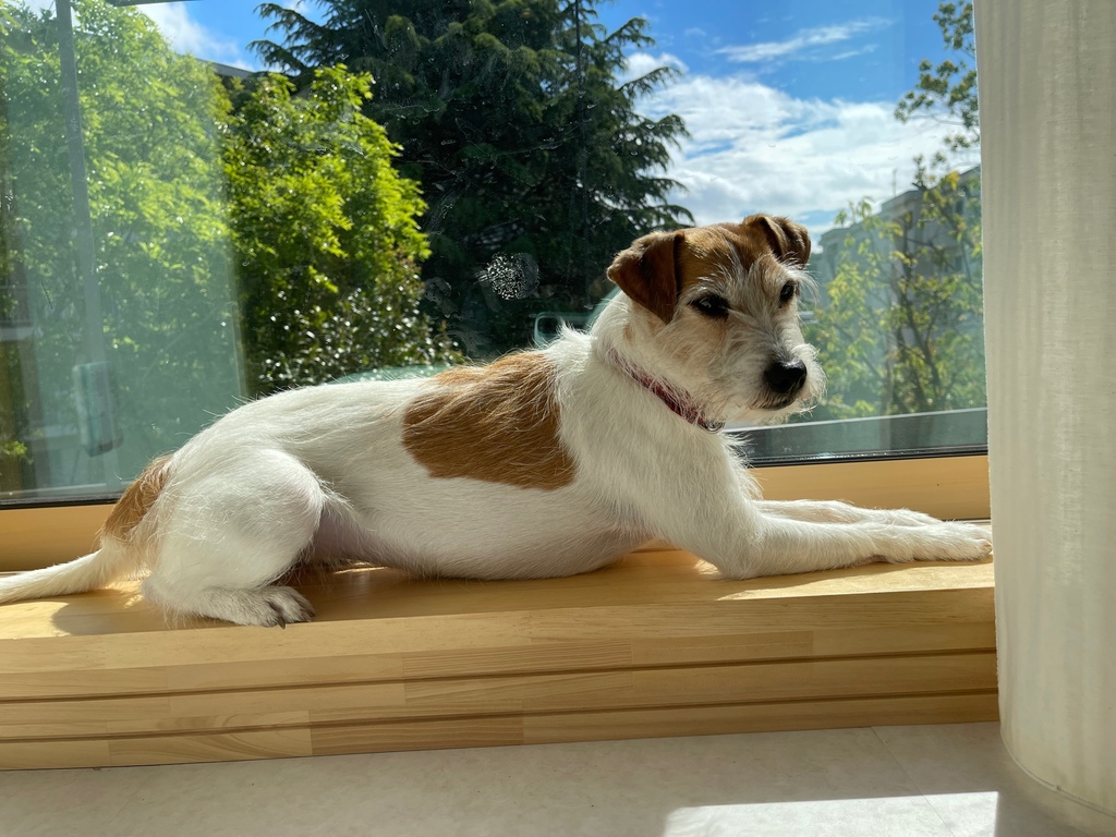 アリスは窓から外をよく見ていますが、よくある近隣トラブルの例のように、人やバイクが目の前を通るたびに吠えたりすることはありません。なぜなら見える景色の先には人間の姿や社会性の刺激がないからです。過去のコラム犬の家を設計するときには外部からの刺激を無くす方がよいと書きました。しかし犬にとって心地よい刺激であれば、たくさん取り入れてあげたいものです。改めて1階の平面図を見ていただければわかりますが、1階の道路側には全く窓を設けていません。そのようにして設計で住宅の中に入ってくる刺激をコントロールしているのです。