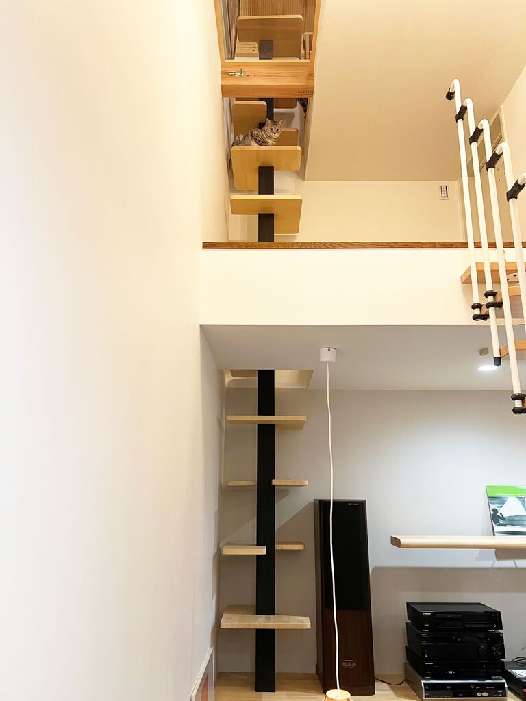 自邸で猫ステップを採用した場所は、1階と2階の猫ダイニングとその上部にある吊戸棚に上がるためのものです。