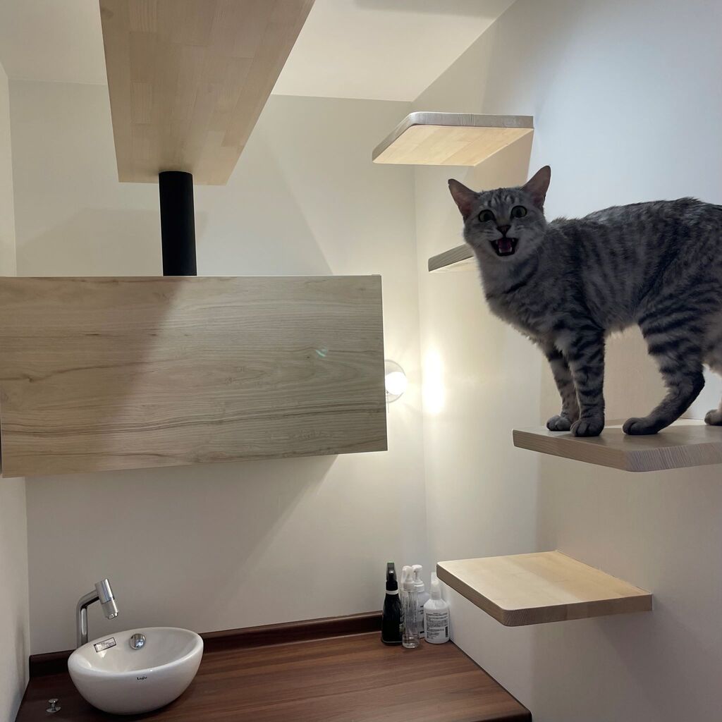 これまで私が設計してきた家では、猫ステップを猫の昇降手段として多用してきましたが、この連載のpart1で触れたように、住居を都市に見立てる考え方を形にあらわす際、猫ステップは地形のイメージよりかなり小さい造形になってしまうので、自邸では採用を最小限にとどめています。しかし、省スペースで高い場所にいくパーツとしては優れたものだと思います。