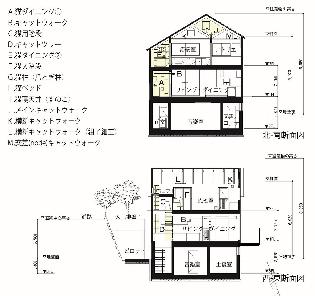 猫と暮らす家は猫の縦方向の動きを意識してデザインしなくてはなりません。猫と暮らす家に限らず、あらゆる建築設計の上手さや巧みさは断面にあらわれてきます。断面を洗練させるのには仕事のクオリティーが高い設計事務所での実務経験がいりますから、それはアマチュアの領域ではありませんし、同じプロでも断面計画にはうまい/下手がはっきりとあらわれてしまいます。