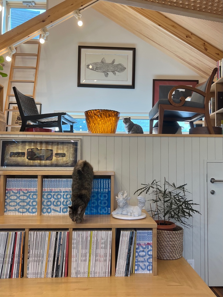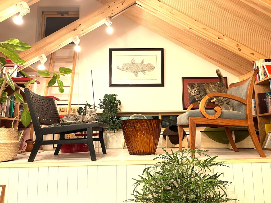 猫ロフトは、その上にいる猫と人間の視線の位置がだいたい揃うので、飼い主にとっては楽しい仕掛けです。床より高い位置にあるので何もなくても猫はそこに行きますが、猫ロフトにだけ床暖房を入れておくと、冬場は必ず猫がいる場所になりますし、部屋全体を暖かくするよりは冬場の省エネに貢献してくれます。猫ロフトの上には人間用の一人掛けソファのいいものを2脚置いています。目立ちますから、ほどほどにいいものを選んで置いています。