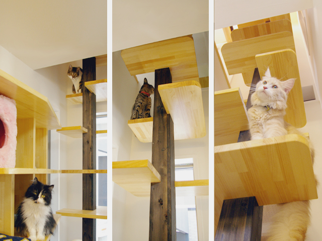 ■このキャットツリーは、1階から2階、さらにロフトまで一気に上ったり下りたりできるように、高さは6mもあります。 それでは、キャットツリーの途中にある「秘密の入口」に入ってみましょう。