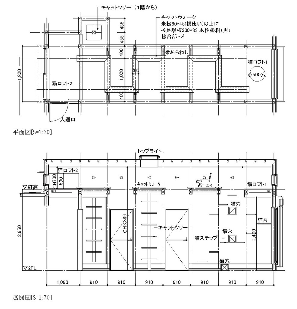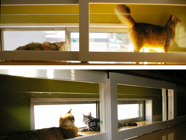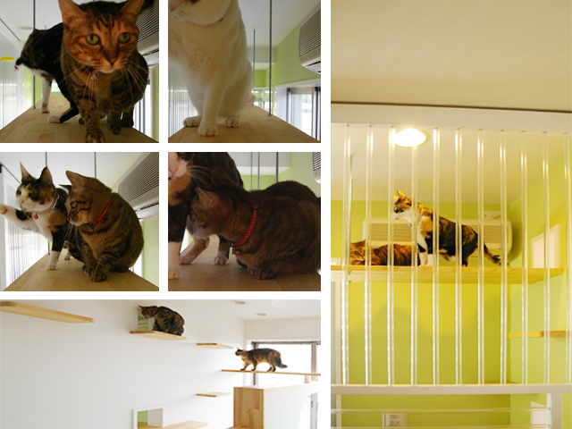 ■黒い板の部分がキャットウォーク。全長10.5mあります。 大人の猫はルート通りに、ジグザグに歩きますが、 若い猫達は、平行になっている80cmの距離を余裕でジャンプしていきます。