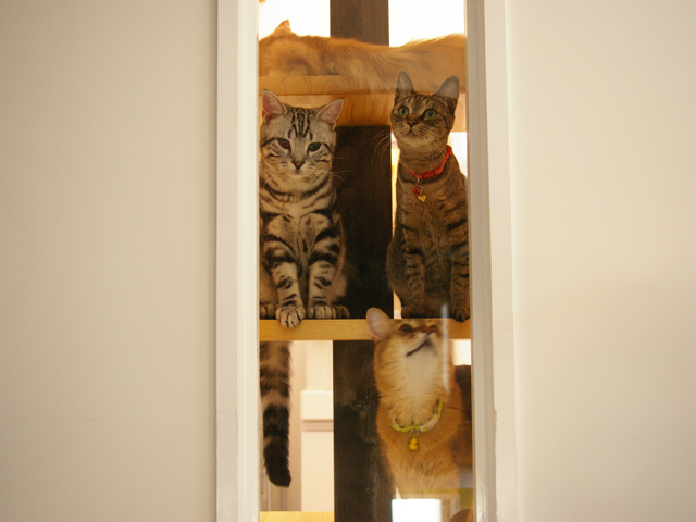 ■ふと振り返ると、たくさんの猫達が先ほどのキャットツリーに座って、 ガラス越しに書斎の中に居る御主人を覗いています。興味津々のご様子。