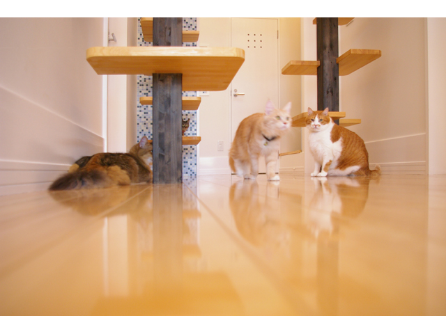 ■猫ロフトは床掃除ができるようにメンテナンス穴が開いています。猫台や床の上でも猫達は遊んでいます。