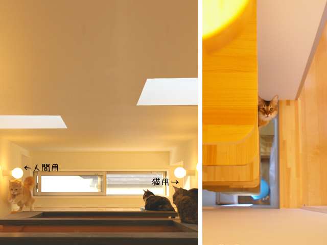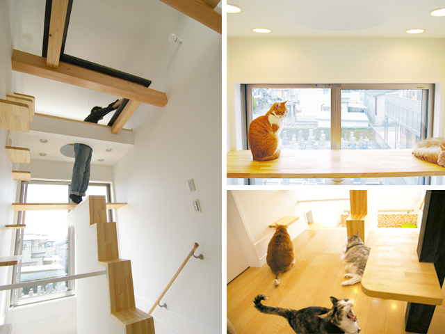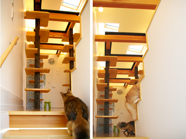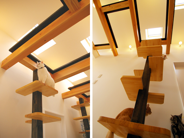 ■キャットウォークへは、 壁面から突き出た猫ステップ、階段手すりを利用した猫階段を使っても登れます。 その途中には外を眺めるための猫台や隣室へつながる猫穴などもあります。