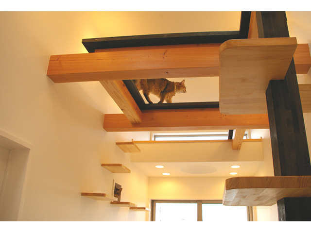 ■キャットウォークは2階の小屋梁の上に、幅20cmの板をジグザグに配置して造っています。 上部には天窓が3つあったりして、結構、お昼寝の場所としても活用されています。