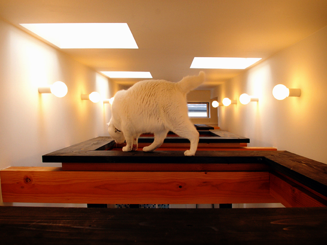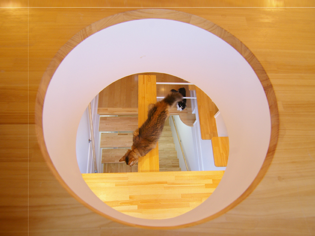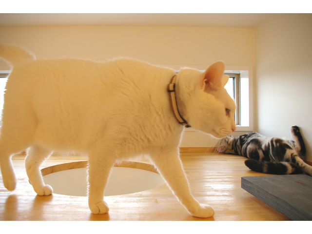The centrepiece is a zigzagging “cat walk” that soars over the central landing at ceiling height—a wonderful way to show off the house’s cat inhabitants, who come in all coats and colours and love to laze around on high. In animal terms, Mr. Hirose says that these passages give the cats “vertical” exercise, as well as roaming space. The latter is important in a property with so many animals living in close proximity. After all, cats do have their hierarchies, and having enough space to disperse allows weaker members to keep out of the way of more dominant members, or even to hide from them. The theory is that this results in fewer fights, and a chat with the gloating owners of the house confirms that this is indeed the case, making for much less stress all around.