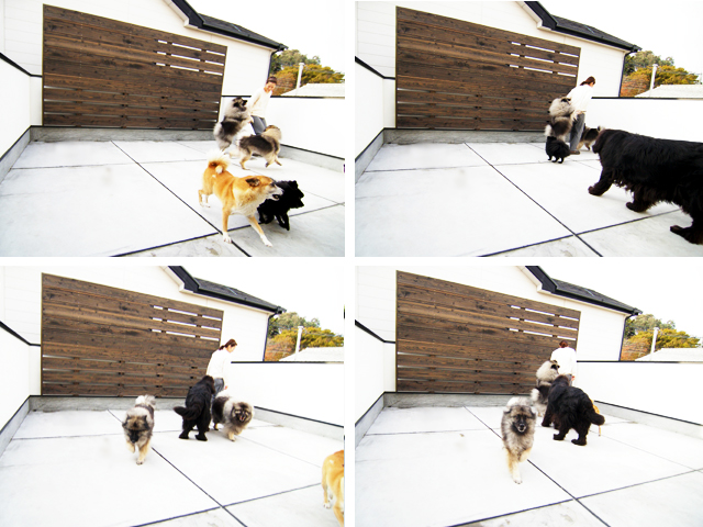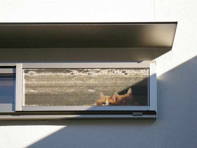 ■ 2階の洋室には屋上庭園(ドッグラン)が併設されています。 そこで自由に走り回る5匹の犬達の様子を猫達はロフトにある窓越しに見ていたりします。