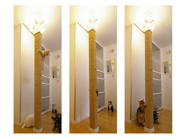 ■この麻縄を巻いた柱は猫の爪とぎ用に造られました。時々、木登り大会が行われます。 ちなみに16匹の猫達は、この「爪とぎ柱」でしか爪を研ぎません。 ドア枠を傷つけたり、壁紙を破ったりなんて事はしません。