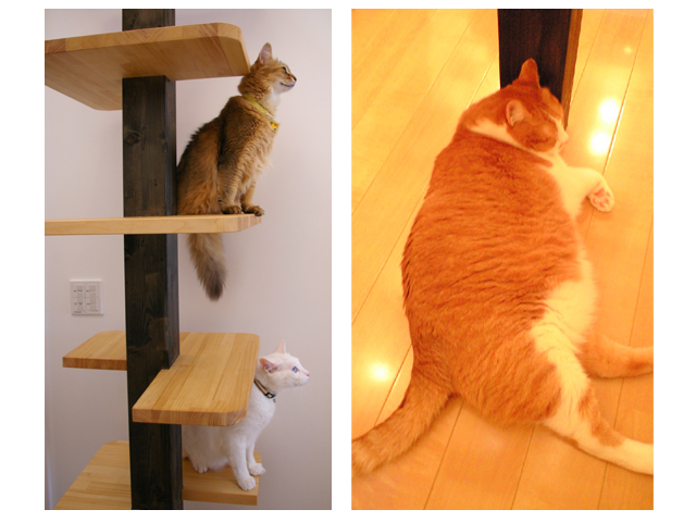 ■キューブベッド用多段棚は、それ自体が階段状になっていて、 1階から2階へ上がるキャットツリーにつながっています。 ここからたくさんの猫達が、家の中での散歩に出かけていきます。