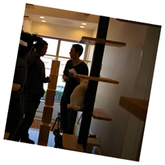 ■ PlayRoomの上空に張り巡らされているキャットウォークに行くには、 猫用らせん階段「キャットツリー」を使います。段差が33cm~43cmのものまで4本用意されています。 [ちなつちゃん]は段差43cmのものがお気に入り。