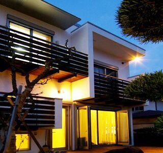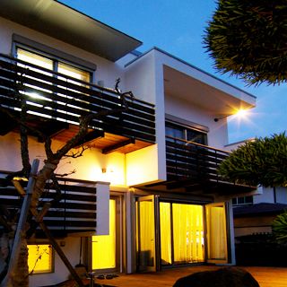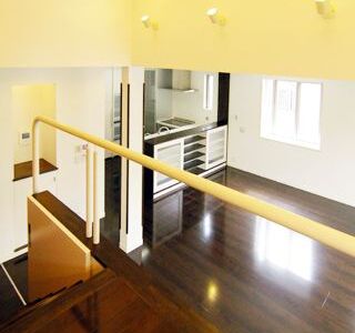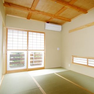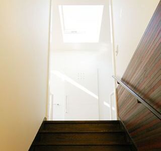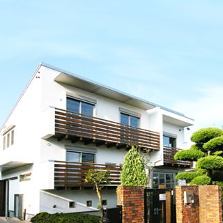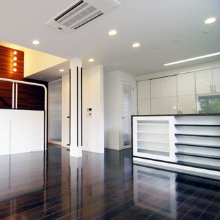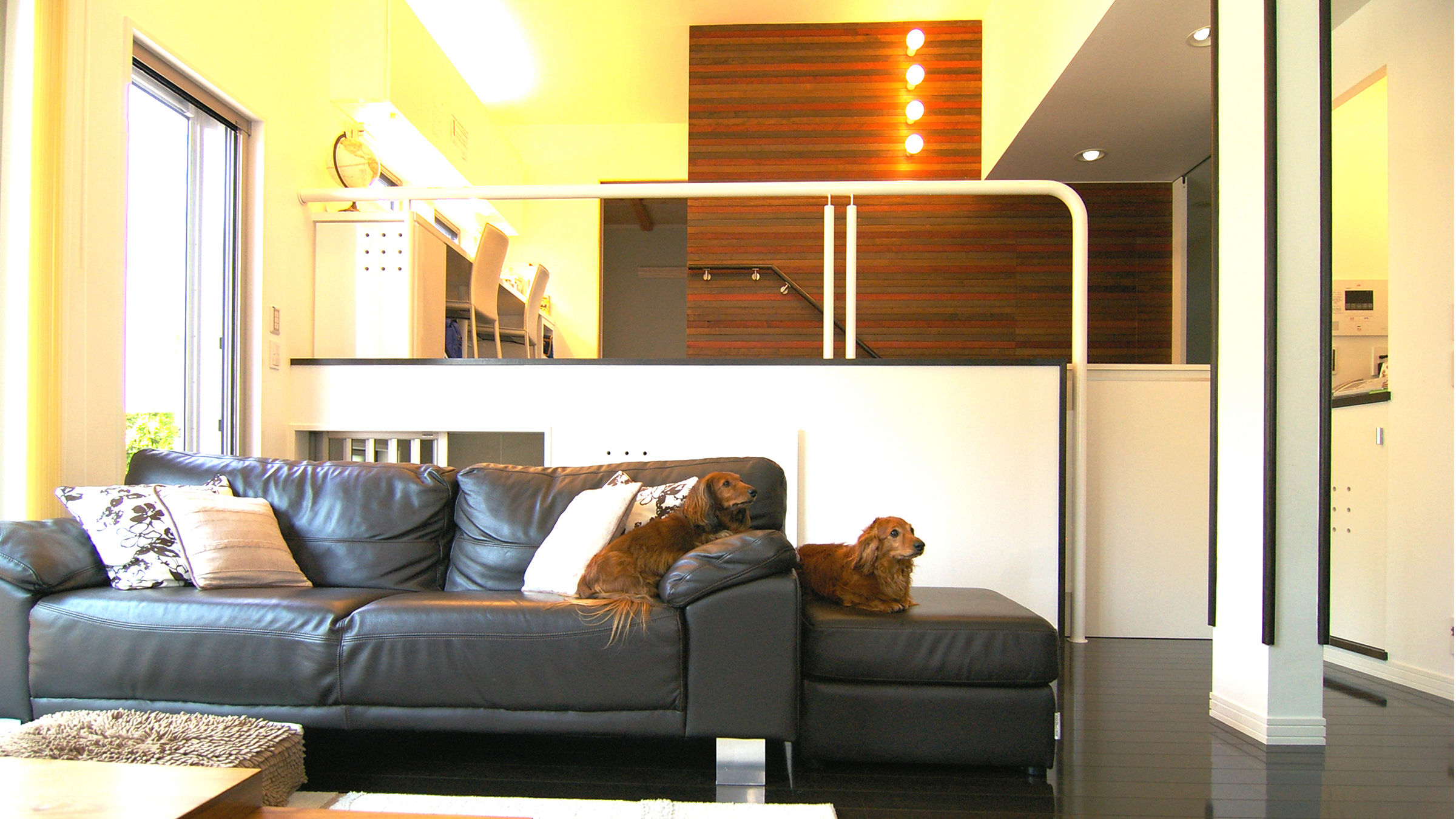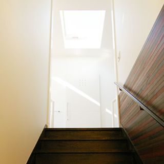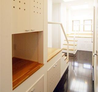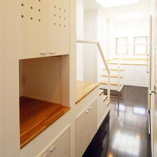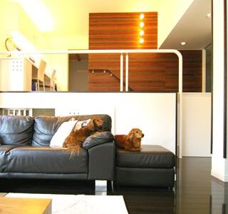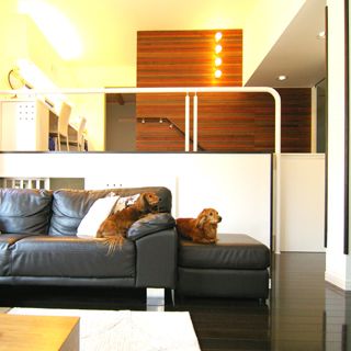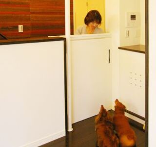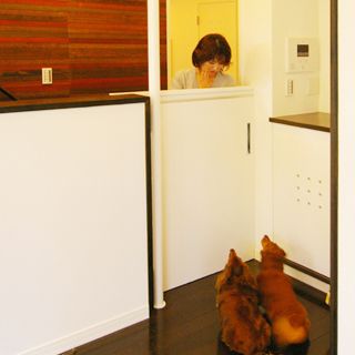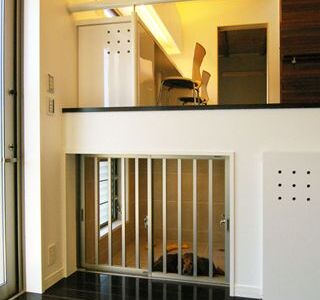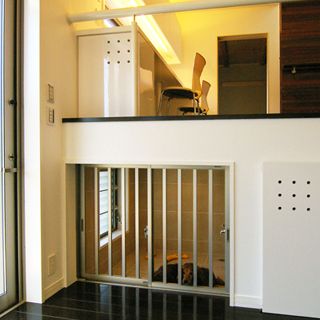建ペイ率30%、容積率60%という厳しい法規制の中で 居住空間を十分に確保しながら最大限の収納スペースを 得るために、法的に容積不算入となる納戸を1階に配した、 変則的スキップフロアーを採用。 中2階のスタディーコーナーの下部には完全防水の 屋内犬小屋をリビングに向けて計画しWDLRを確保している。 また、スキップフロアーが生み出す、変化に富む天井高と床レベルは、 視覚的な面白さのみならず、犬との暮らしの上で重要な、 「ゾーニング」と「風の道」を発生させる機能性を持っている。 長年に渡って行ってきたフィールドワークを元に、 「愛犬家住宅の間取り」の完成形として設計された作品の1つである。