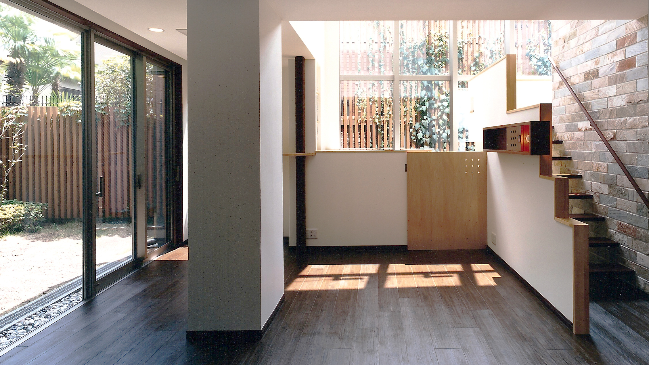 - 犬と猫と暮らす家。犬5匹と猫1匹と暮らす4人家族のバリアフリー住宅。吹き抜け部分にホームエレベーターを設置し、エレベーターシャフトを囲むように階段を計画した。階段の下は屋内犬小屋になっている。