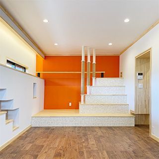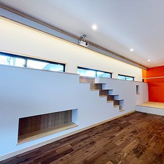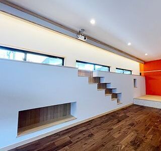 ここではすでに他のプロジェクトで試みていた猫壁(猫専用の階段や飾り棚を掘り込んだ壁面)を大胆に取り入れ、猫壁の上部はすべて猫が歩きながら外を見ることができるキャットウォークになっている。そして猫大階段は、この広いリビングのフォーカルポイントにふさわしく、貝殻を用いたモザイクタイルでケコミ部分を仕上げている。